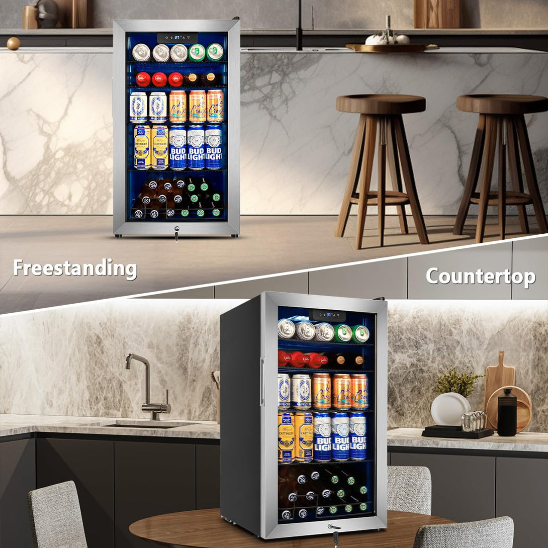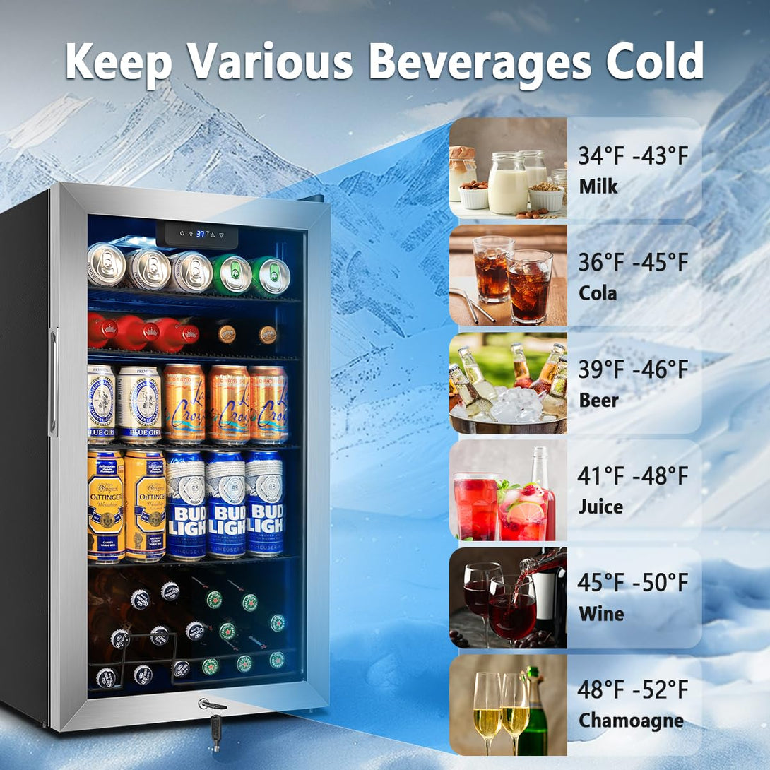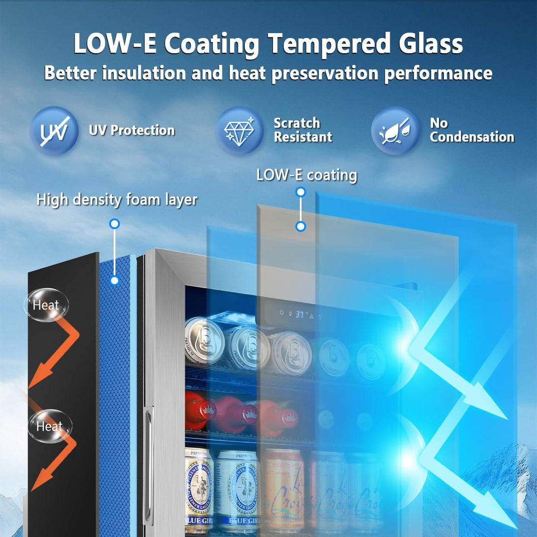 Keep your drinks perfectly chilled and always within reach with this 126 Can Beverage Refrigerator Cooler. With a spacious 3.2 Cu. Ft. capacity, it fits up to 126 cans or 75 bottles-ideal for entertaining, home bars, offices, or dorms. The sleek black design and Low-E double-layer tempered glass door not only look great but also offer excellent insulation, UV protection, and zero condensation for a clean, modern finish.Precision touch screen control gives you 1°F accuracy between 34°F-64°F, so every drink is at its best. The powerful R600A compressor cools quickly and evenly with 360° frost-free air circulation, while the whisper-quiet operation keeps noise under 36dB.Customize your storage with 4 adjustable shelves, built-in LED lighting, and a reversible door. Safety lock and door seal keep your collection secure, and the temperature memory function protects your settings during power outages.ETL and DOE certified, this energy-efficient mini fridge uses under 0.5 kWh per day-costing less than $0.10/day to run. Whether it's a gift or a personal upgrade, this beverage cooler combines premium performance, modern design, and worry-free convenience.