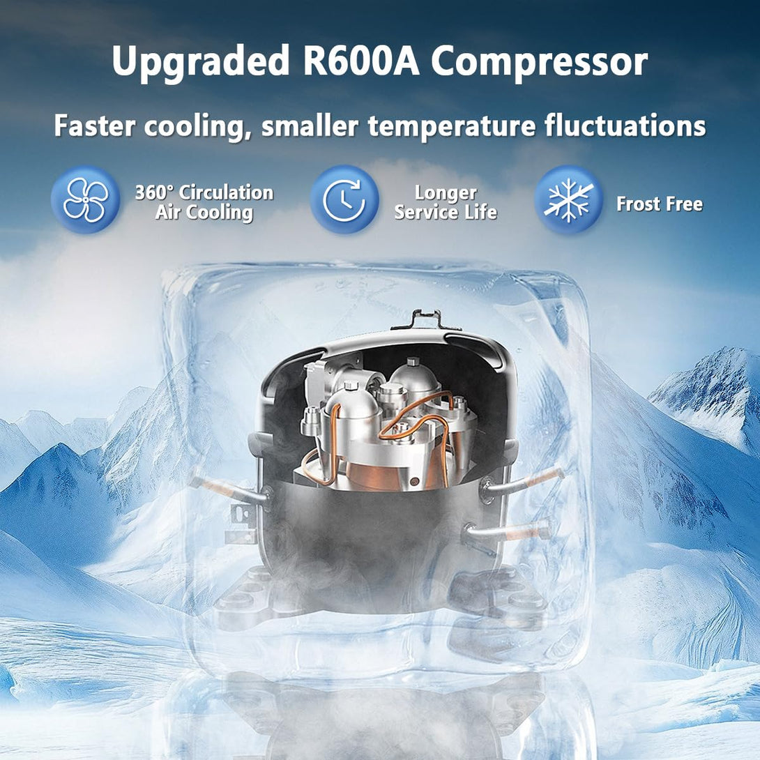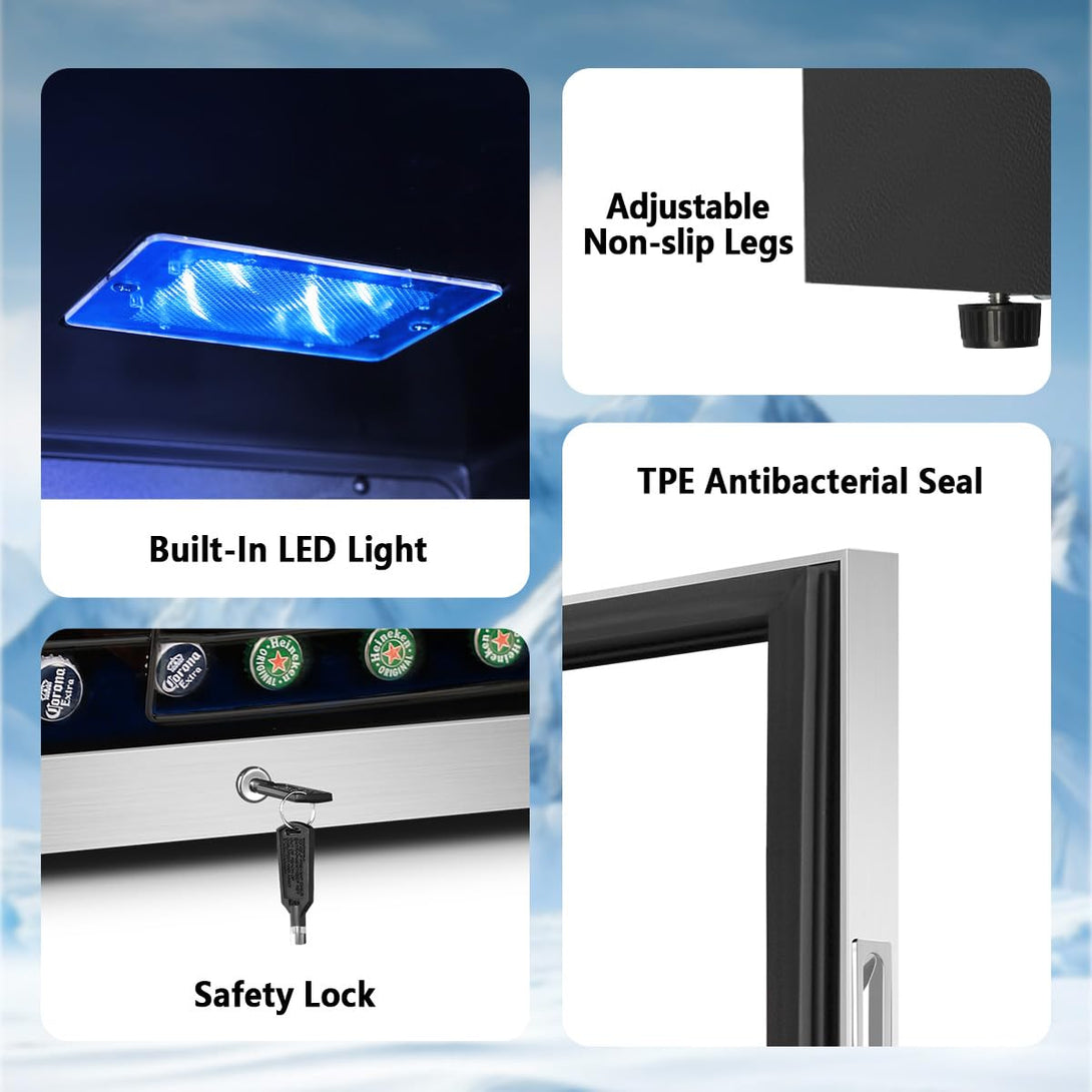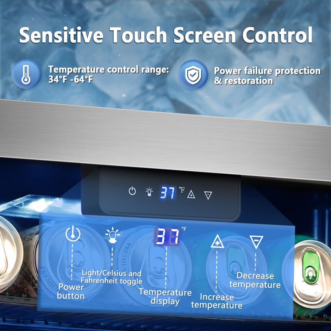 Keep your drinks perfectly chilled and always within reach with this 126 Can Beverage Refrigerator Cooler. With a spacious 3.2 Cu. Ft. capacity, it fits up to 126 cans or 75 bottles-ideal for entertaining, home bars, offices, or dorms. The sleek black design and Low-E double-layer tempered glass door not only look great but also offer excellent insulation, UV protection, and zero condensation for a clean, modern finish.Precision touch screen control gives you 1°F accuracy between 34°F-64°F, so every drink is at its best. The powerful R600A compressor cools quickly and evenly with 360° frost-free air circulation, while the whisper-quiet operation keeps noise under 36dB.Customize your storage with 4 adjustable shelves, built-in LED lighting, and a reversible door. Safety lock and door seal keep your collection secure, and the temperature memory function protects your settings during power outages.ETL and DOE certified, this energy-efficient mini fridge uses under 0.5 kWh per day-costing less than $0.10/day to run. Whether it's a gift or a personal upgrade, this beverage cooler combines premium performance, modern design, and worry-free convenience.