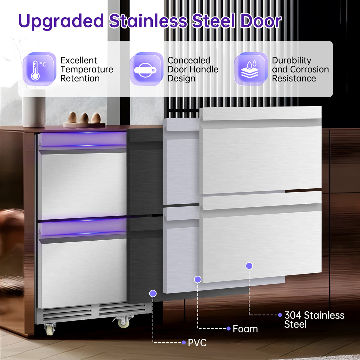 Crafted from premium 304 stainless steel, this door delivers exceptional temperature retention through advanced foam insulation that minimizes thermal leakage. The reinforced construction withstands daily use while maintaining complete corrosion resistance. Its streamlined concealed handle eliminates protruding hardware, creating a seamless appearance that complements any kitchen aesthetic. The multi-layer sealing system ensures perfect closure, while the scratch-resistant surface preserves its polished look. This professional-grade component combines industrial durability with precision temperature management for optimal wine preservation.