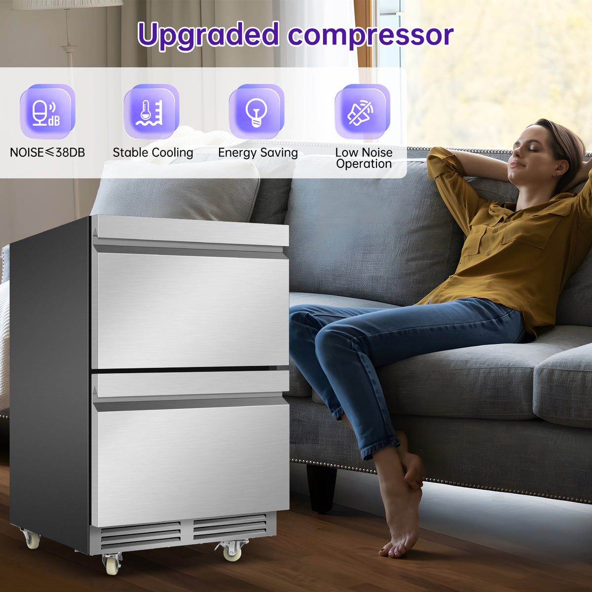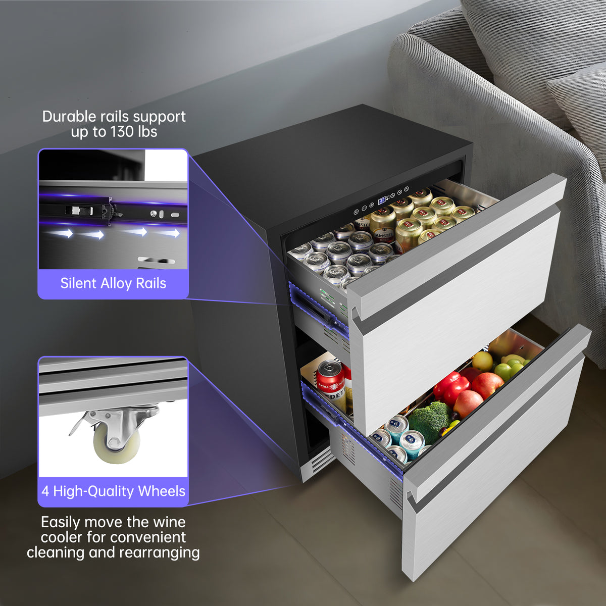 Engineered with industrial-grade silent alloy rails rated for 130-pound capacity, this wine cooler combines rugged durability with whisper-quiet operation. The reinforced rail system features triple-track ball bearings and anti-tilt locks for buttery smooth drawer movement even under full load. Four 360-degree dual-wheel casters with individual braking systems provide effortless mobility across different floor surfaces while maintaining absolute stability during operation. The reinforced steel frame and impact-resistant corners protect your investment during transportation, while the low-profile wheel design prevents tripping hazards. Whether you're reorganizing your space or moving between rooms, this mobility-optimized design ensures heavy-duty performance meets ultimate flexibility for both residential and commercial environments.