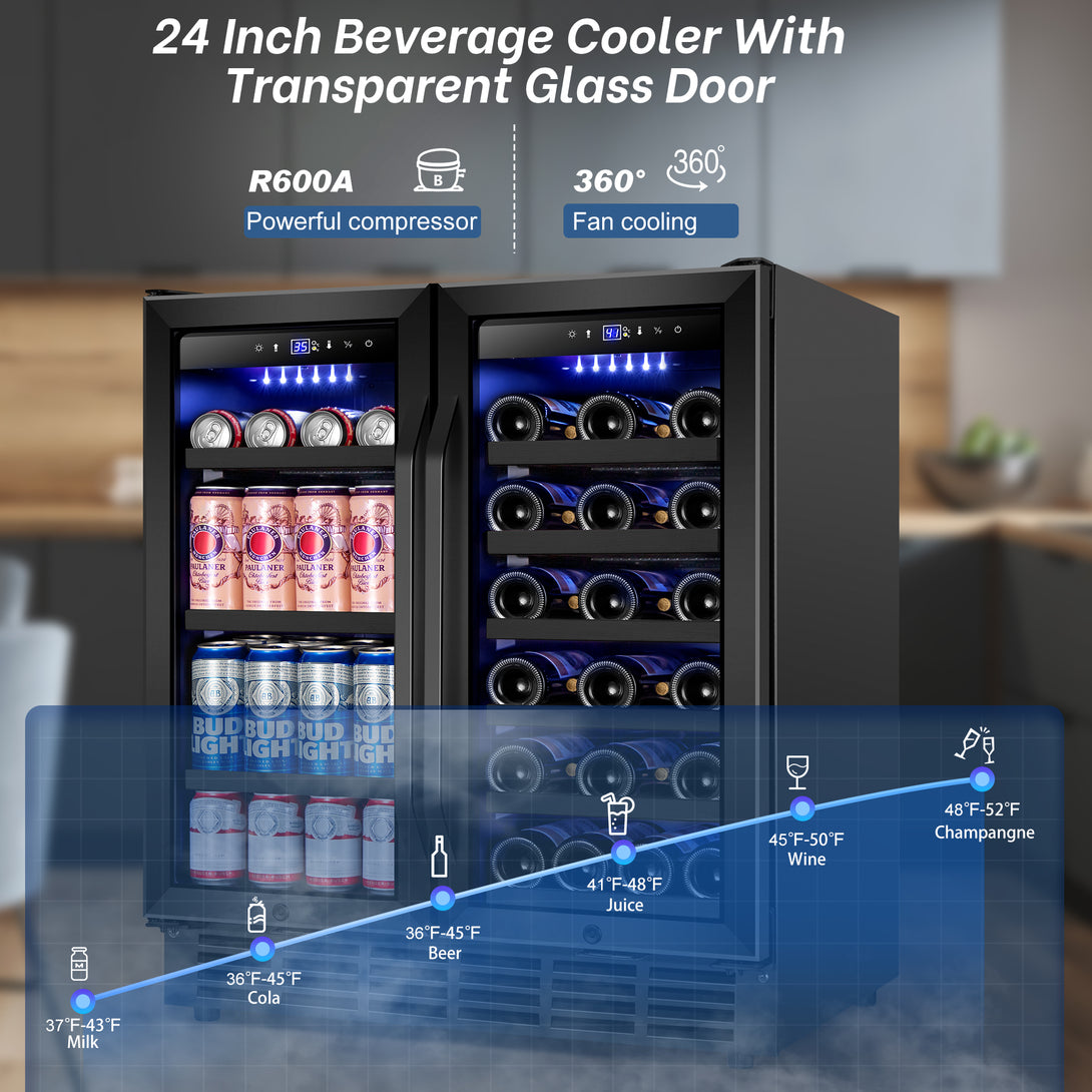 Introducing our 30.31 in. dual-zone beverage cooler, expertly designed to keep your drinks and wine at their perfect serving temperatures. With independent cooling zones, you get precise control: 35-50°F for beverages and 41-64°F for wine. Store up to 80 cans of drinks and 28 bottles of wine in its spacious 6.2 cu. ft. interior, ensuring everything-from beer and soda to fruits, veggies, and dairy-stays fresh and chilled just the way you like it. Whisper-quiet operation at just 36dB makes it ideal for bedrooms, home bars, or offices. The adjustable, removable shelves and UV-protected glass door let you organize and showcase your collection in style. Backed by a 1-year warranty for worry-free ownership. Keep it cool. Keep it perfect.