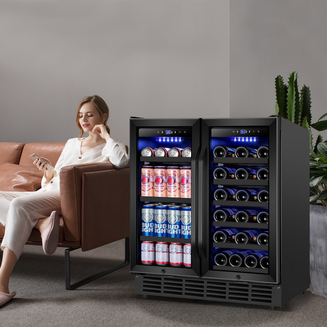30 in. Dual Zone 80-Cans Beverage and 28-Bottles Wine Cooler Frost Free, Tempered Glass Door in Black
