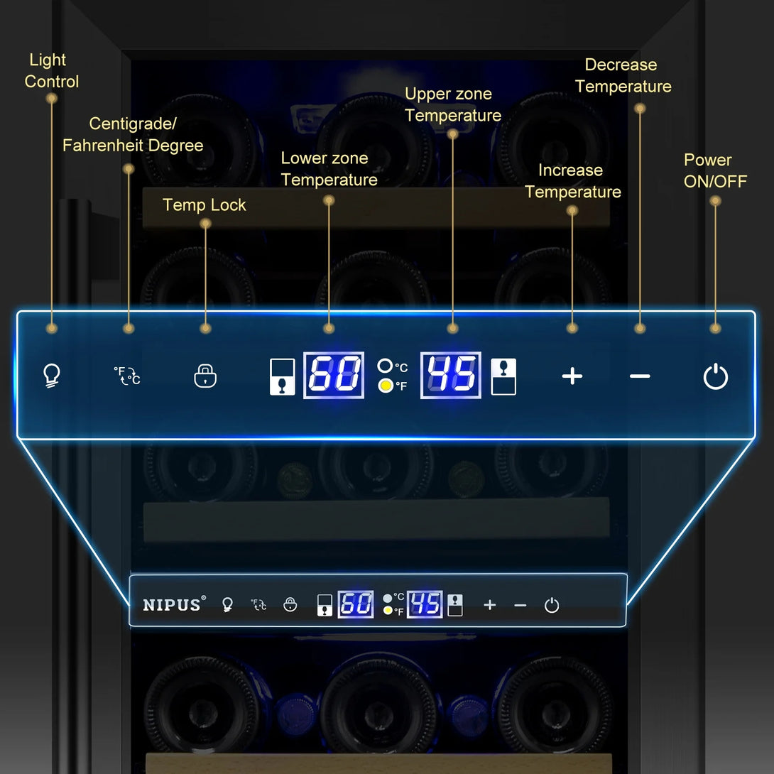 - Two Temperature Zones & Temp Memory Function- Nipus wine cooler keeps your wine and baverage at the suitable temperature thanks to advanced temp control technology.Upper zone :40-55℉, lower zone:55-65℉. Fahrenheit and Celsius can be switched freely.