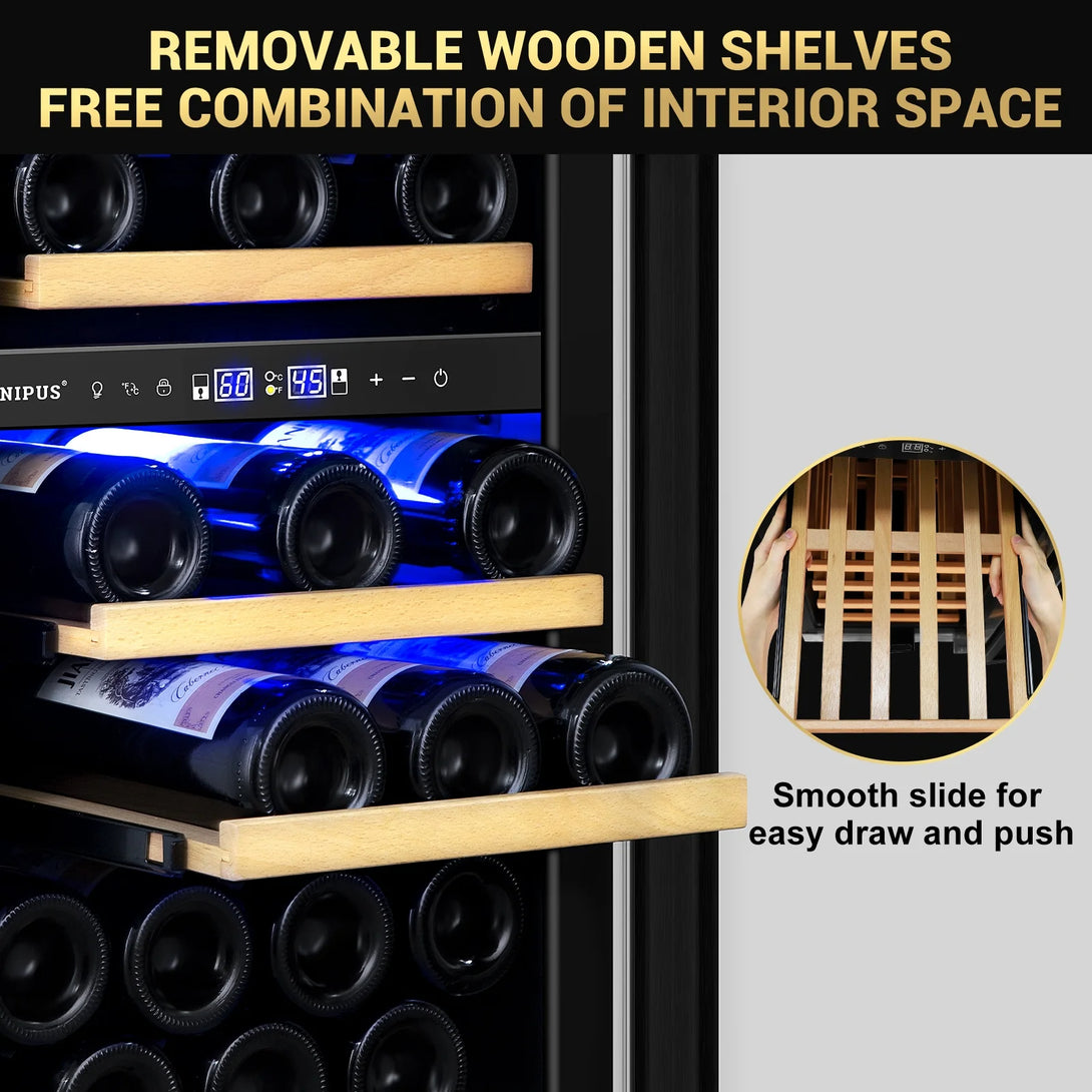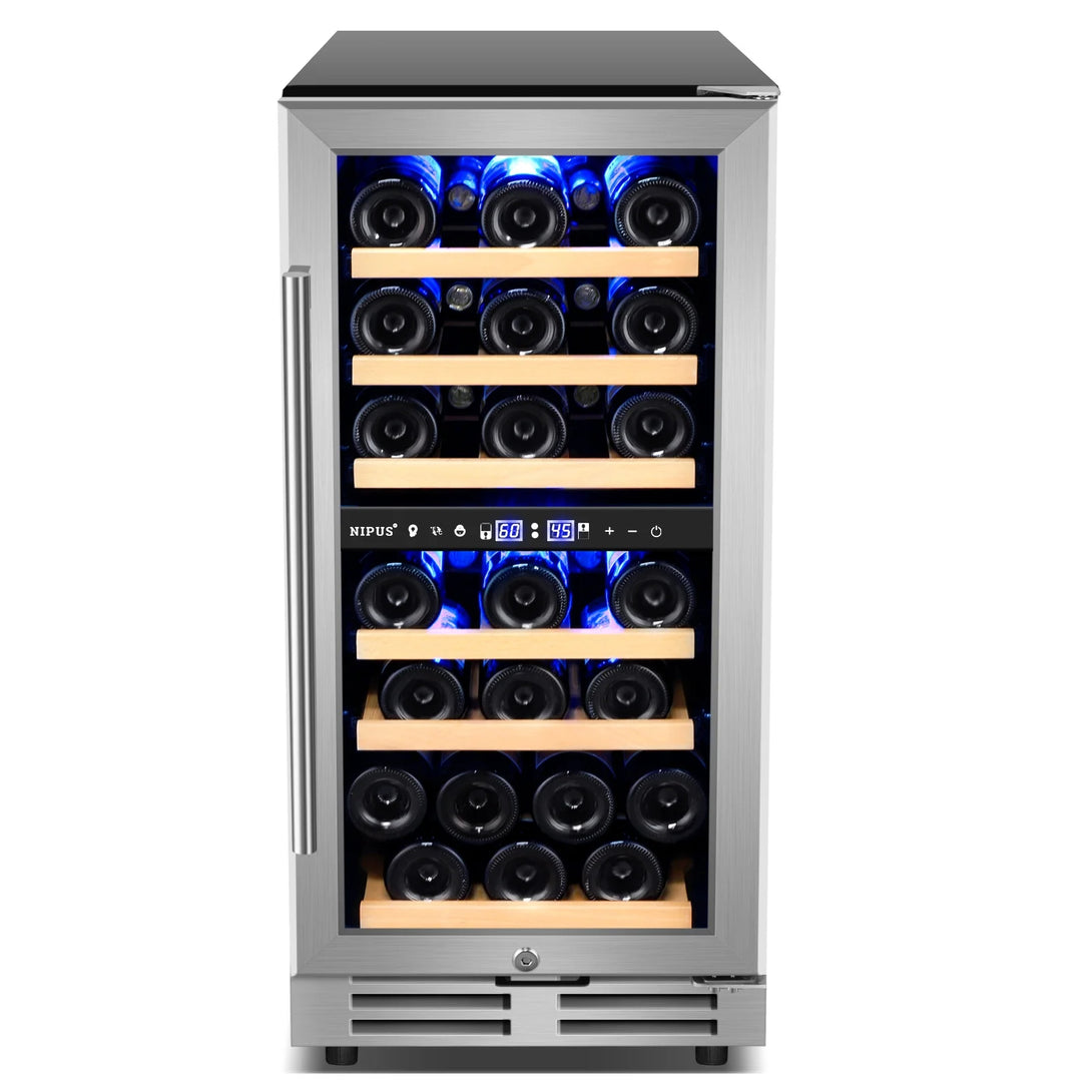 "The Nipus built-in cooler series offers a comprehensive selection of slim options, allowing smaller kitchens to provide convenient and reliable storage for every under-counter space. The NPDUAL04 with a width just shy of 15 inches, is suitable for under-counter installation, and its fully adorned black cabinet also allows for freestanding placement. The double-layered glass door comes with elegant stainless steel trim and two professional handles. A factory installed lock offers added security, with two keys included. Two separate zones allow you to store beverage, water, or soda and other drinks ensuring each bottle is kept under the proper conditions. This unit can hold up to 30 standard Bordeaux style bottles. Features A compact 15-inch design that easily integrates into base cabinets or stands alone as needed. Dual temperature zones for perfect storage of both red and white beverages. Shelves crafted from solid beech wood, providing stability and ease of removal. Equipped with embedded LED lighting for eye-catching and efficient display. Digital controls let you fine-tune temperatures between 40 and 65 degrees. Double-layered tempered glass doors offer added insulation and UV protection. The quiet compressor makes it an ideal choice for kitchens, home bars, garages, and more. Warranty: Nipus beverage refrigerator comes with a one-year warranty service and a 3-year compressor warranty. If you have any questions or concerns, you can contact us at any time. Model: NPDUAL04 Net Weight: 81.5 Ibs. Dimensions(W*D*H): 14.96""*23.03""*33.46"" Bottle Capacity: 30 bottles Minimum Temperature: 40°F Maximum Temperature: 65°F Installation: Built-in or Free Standing Noise: 38db Power: 115V, 60Hz Estimated Yearly Electricity Use (kWh): 146 Watt AMPS: 0.9A Refrigerant: R600a Shelf Material: Beechwood Durability: Mold / Mildew Resistant, Odor Resistant, Rust Resistant, Warp Resistant, Waterproof"