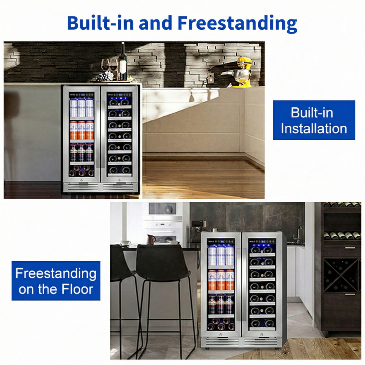 Featuring two separate compartments that independently regulate the temperature of the beverage and wine zones, this dual-zone refrigerator can hold up to 20 bottles of wine and 60 cans of beverages, offering ample space for your favorite drinks. The double-glazed glass door is sturdy and insulated, serving not only as a display but also as protection for your wine and drinks, safeguarding them from harmful UV rays that can affect taste and quality. You have the choice between two styles of stainless steel handles, and a soft blue interior light provides elegant and gentle illumination. It can be installed as a built-in or freestanding unit. The cooler is equipped with three wire shelves for beverages and seven wooden shelves for wine storage. The upgraded compressor ensures faster cooling, higher efficiency, and quieter operation, enhancing your overall comfort. Whether you're a wine connoisseur or simply enjoy a variety of beverages, this cooler is designed to meet your needs while adding a touch of sophistication to your space.