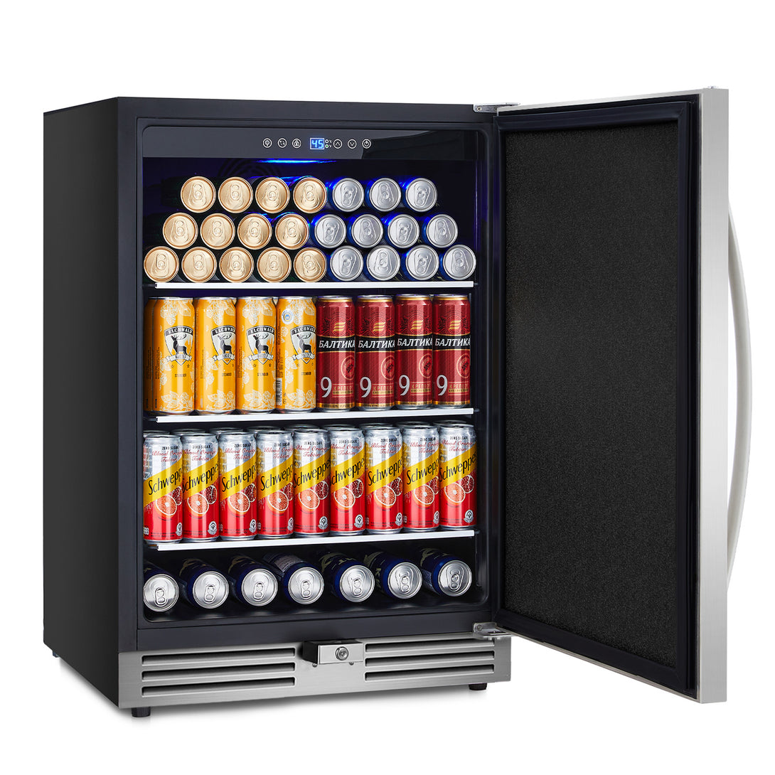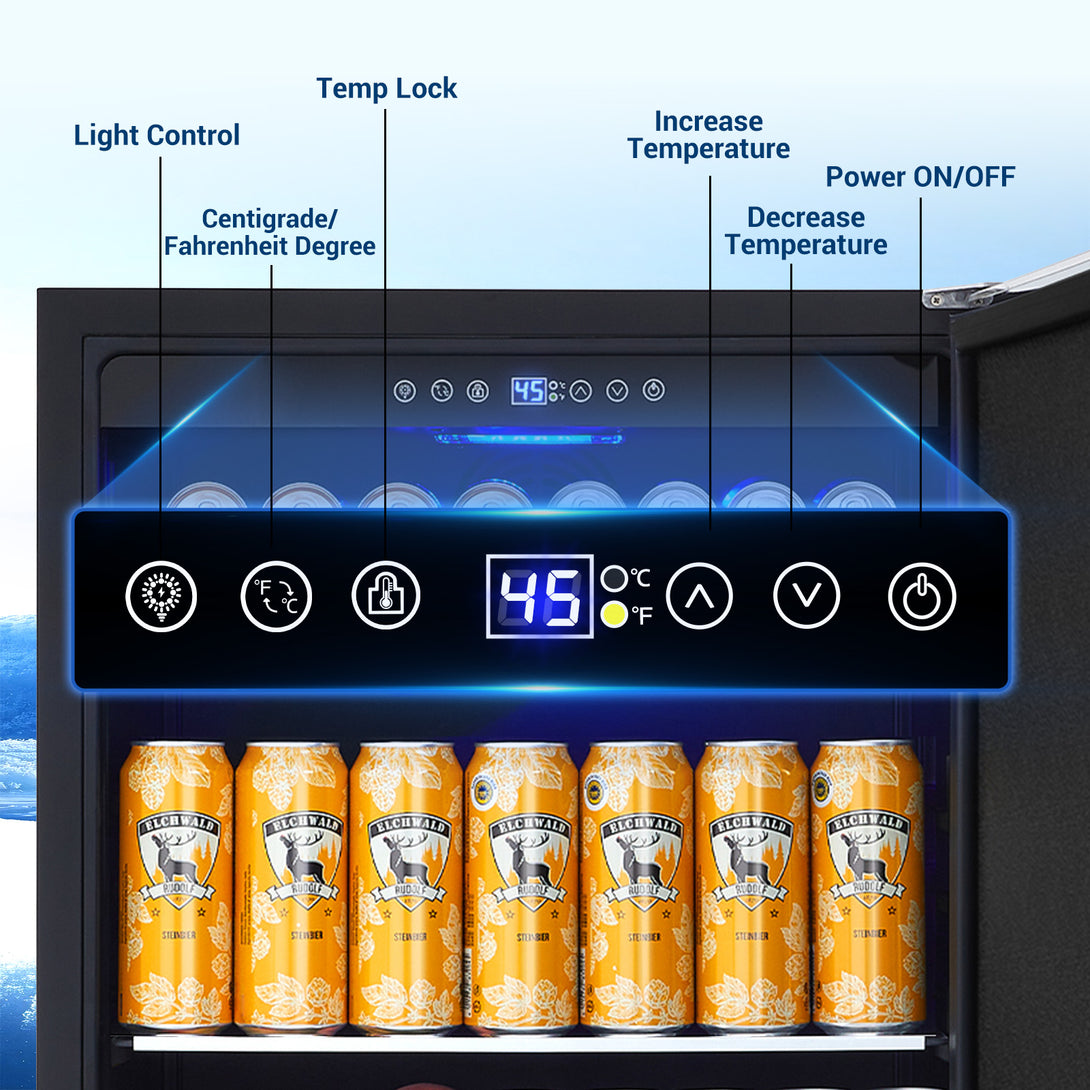 - Spacious 210-Can Capacity with Soft Interior Lighting: With a massive capacity to hold up to 210 cans, this beverage refrigerator offers ample space for all your favorite drinks, from sodas to craft beers. The interior is gently illuminated by a soft LED light, making it easy to find your beverage of choice, even in low-light conditions.