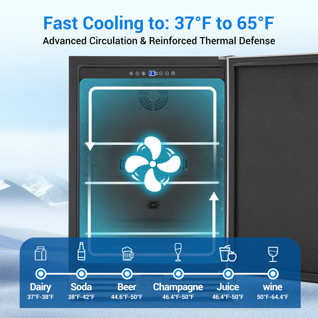 - Powerful & Quiet Cooling Performance: Equipped with an advanced compressor system, this fridge delivers fast, stable cooling and precise humidity control to keep your drinks in perfect condition. It operates with minimal vibration and low noise, ensuring quiet performance without compromising your home or patio environment.