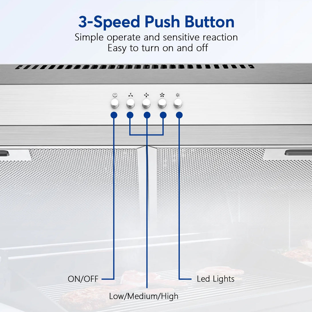 3-Speed Levels- Under cabinet range hood has three speeds that can be adjusted to use different wind speeds according to different scenarios.