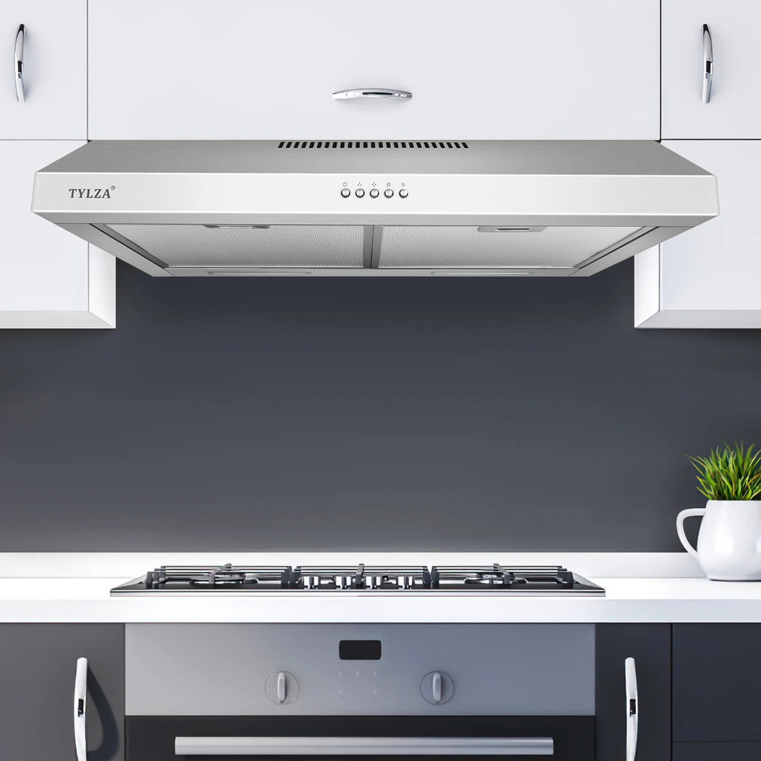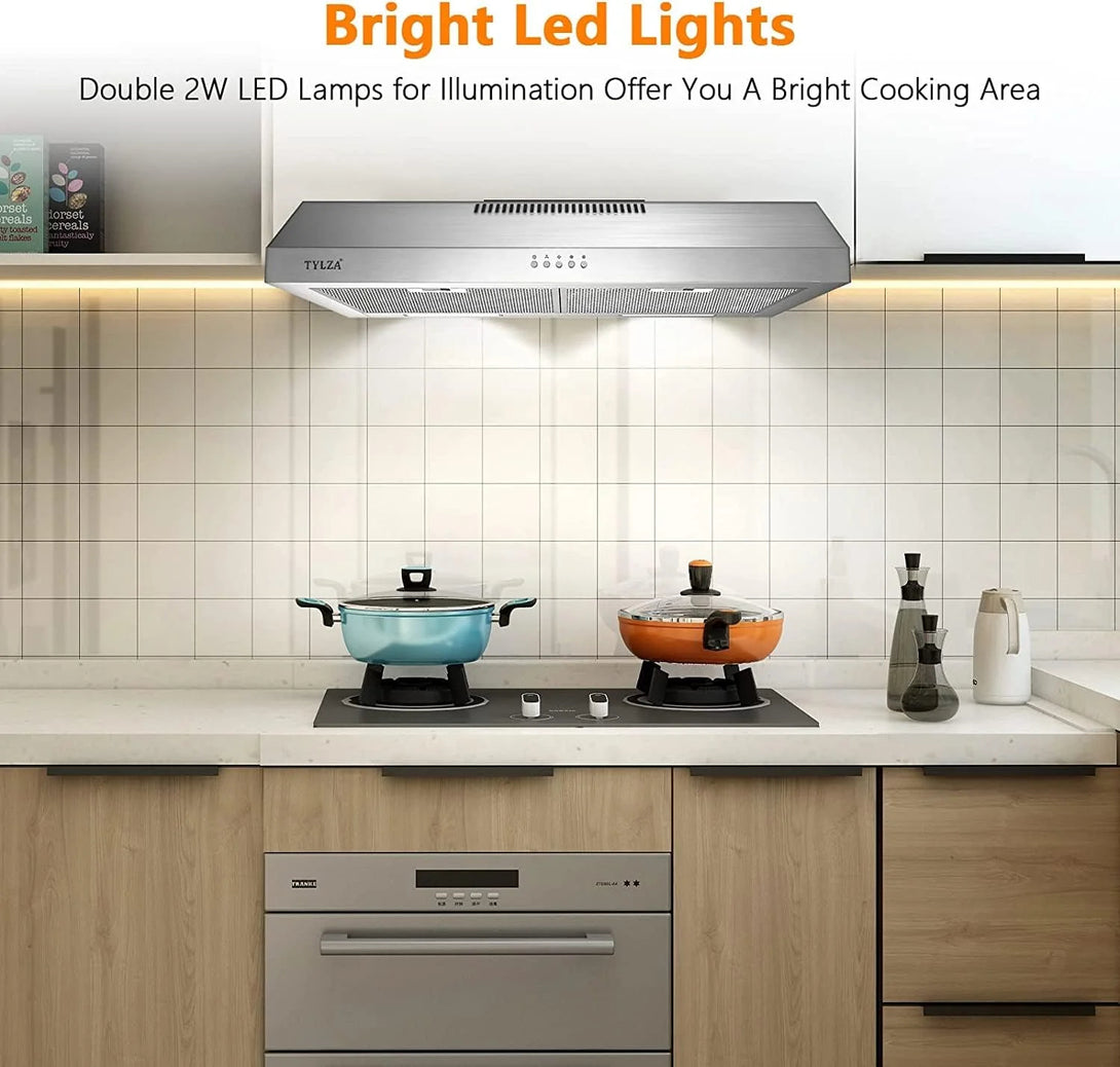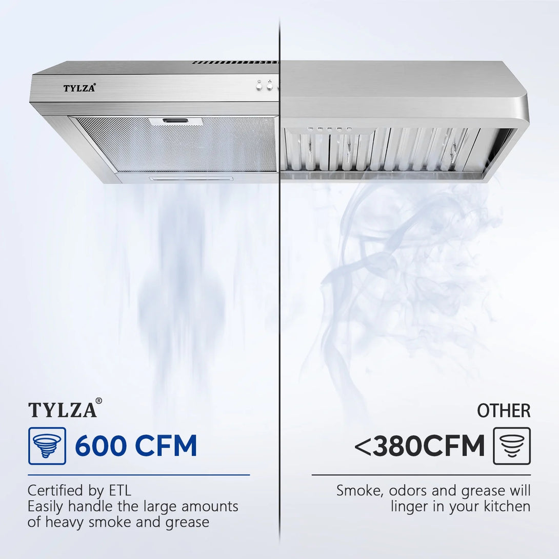 Tylza 30" 600 CFM Stainless Steel Kitchen Under Cabinet Range Hood with 2 x 2W LED Lights and 2 Replacement Charcoal Filter