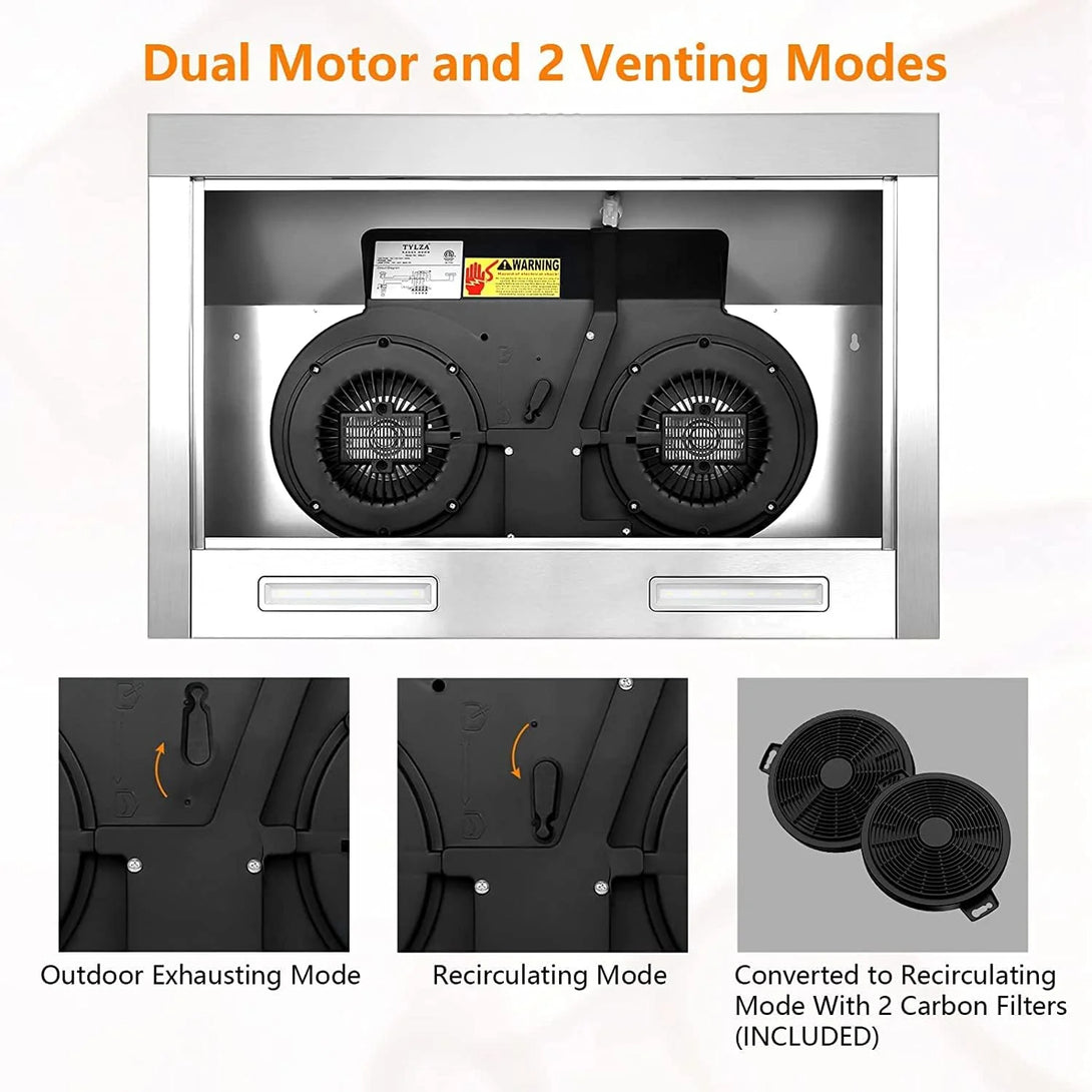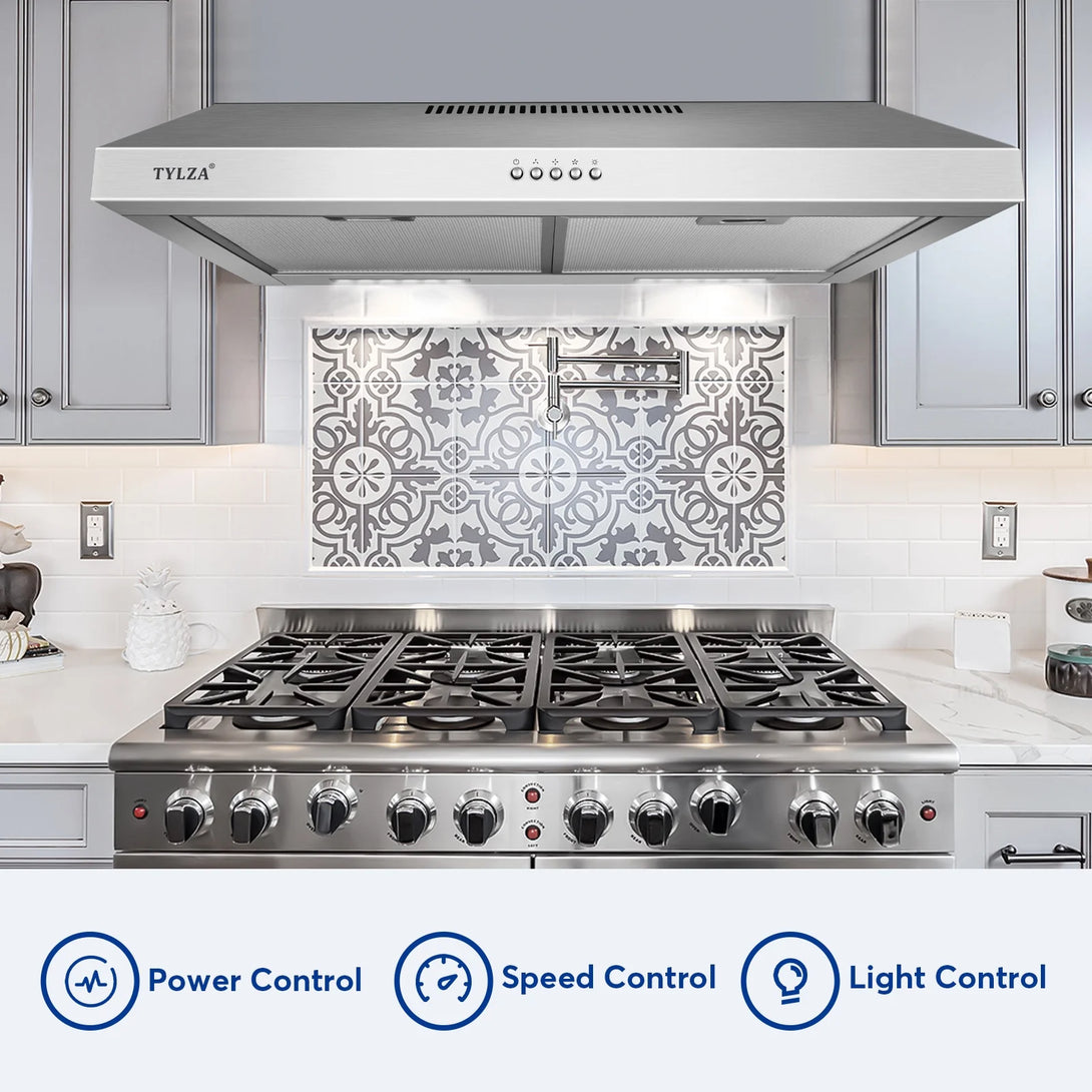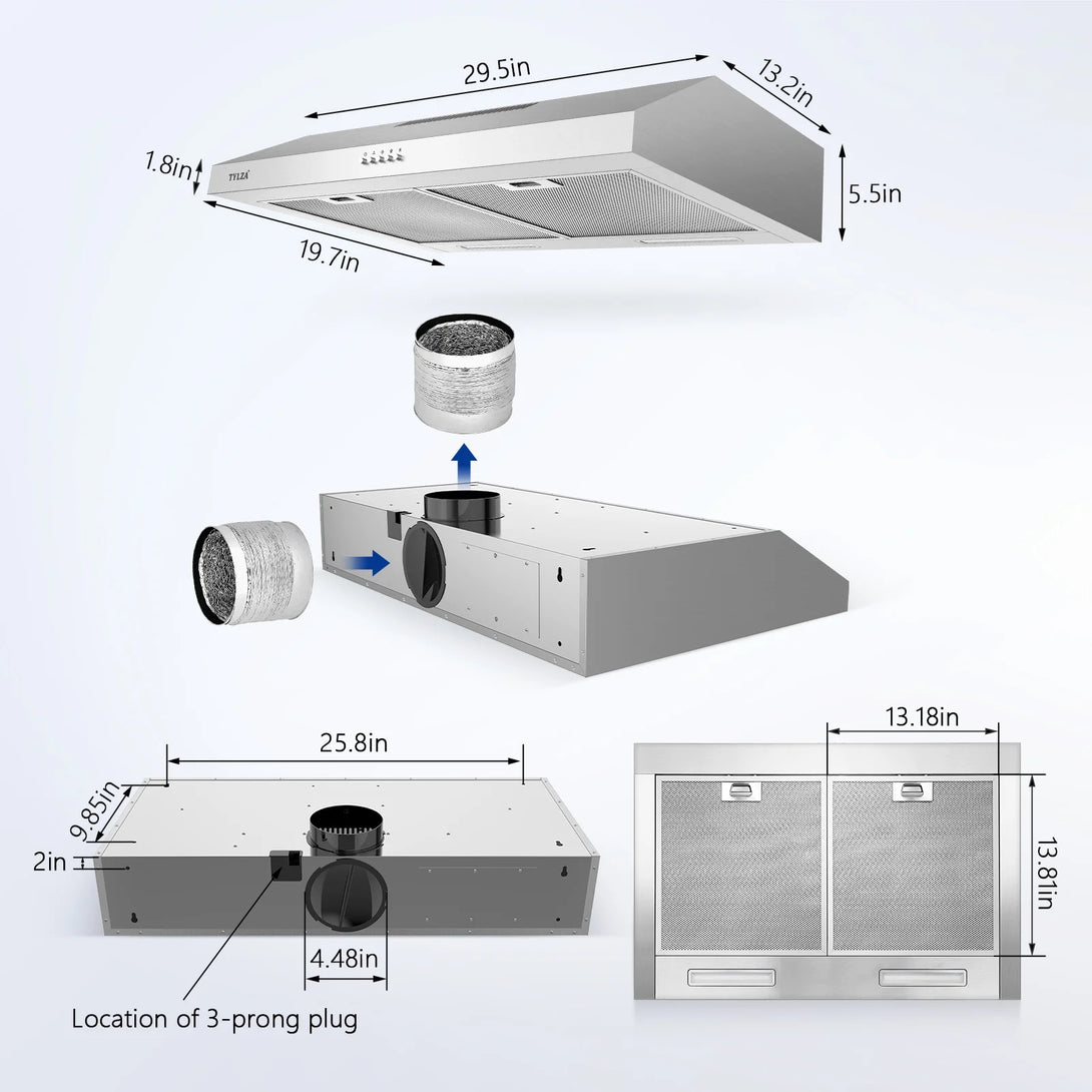 Tylza 30" 600 CFM Stainless Steel Kitchen Under Cabinet Range Hood with 2 x 2W LED Lights and 2 Replacement Charcoal Filter