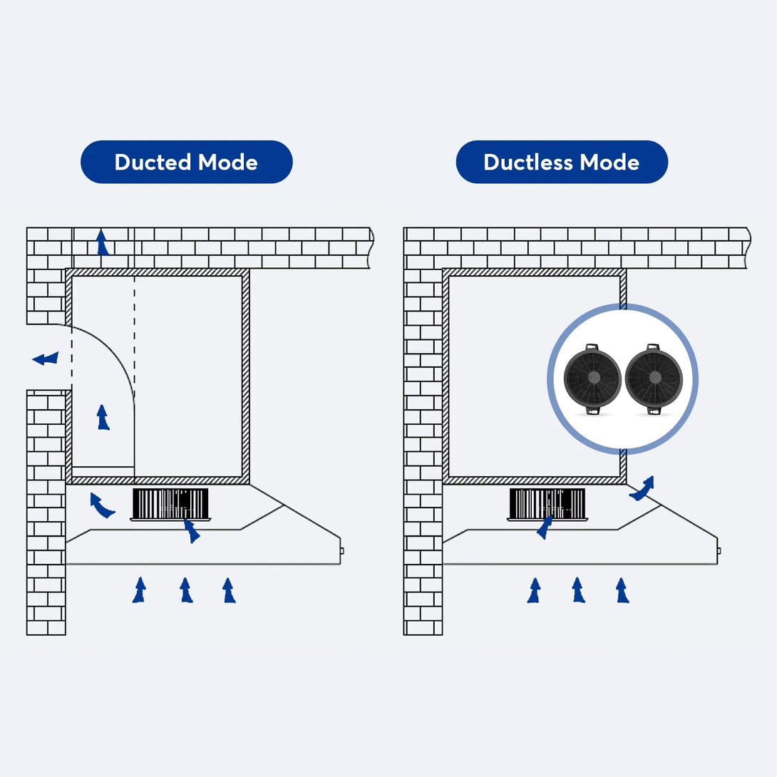 Ductless range hood requires no external venting. Air is pushed through a carbon filters(INCLUDED) system that removes pollutants before circulating the air back into your home. It's also generally far easier to install, as complex ventilation systems and vent pipe are not required. On the other side, ductless range hood requires regular maintenance for carbon filters, which you must clean or replace once every 4-6 months to keep your range hood operating efficiently.
